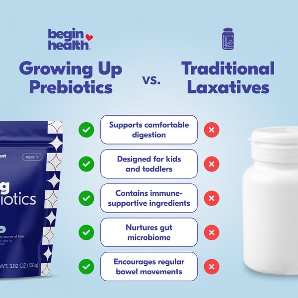 You might be wondering how Growing Up Prebiotics differs from traditional laxatives or other constipation remedies for kids. The big differences come down to gentleness, function, and long-term approach: