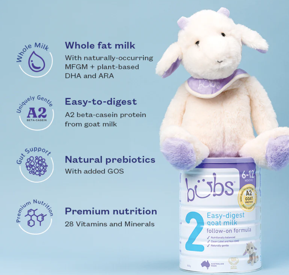 - NATURALLY GENTLE: Bubs Goat Milk Follow On Formula Stage 2 is an Australian Made baby formula exclusively formulated for sensitive tiny tummies ages 6-12 months feeding 4 times per day, all while made to ensure safety, quality, purity, and nutrition
